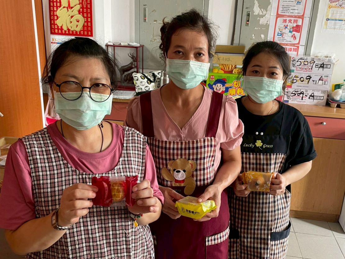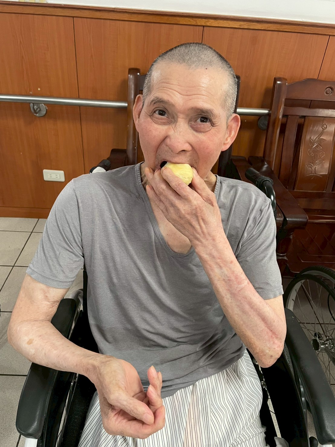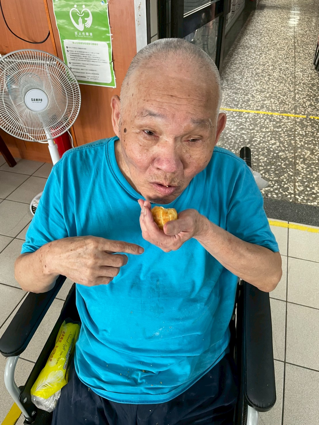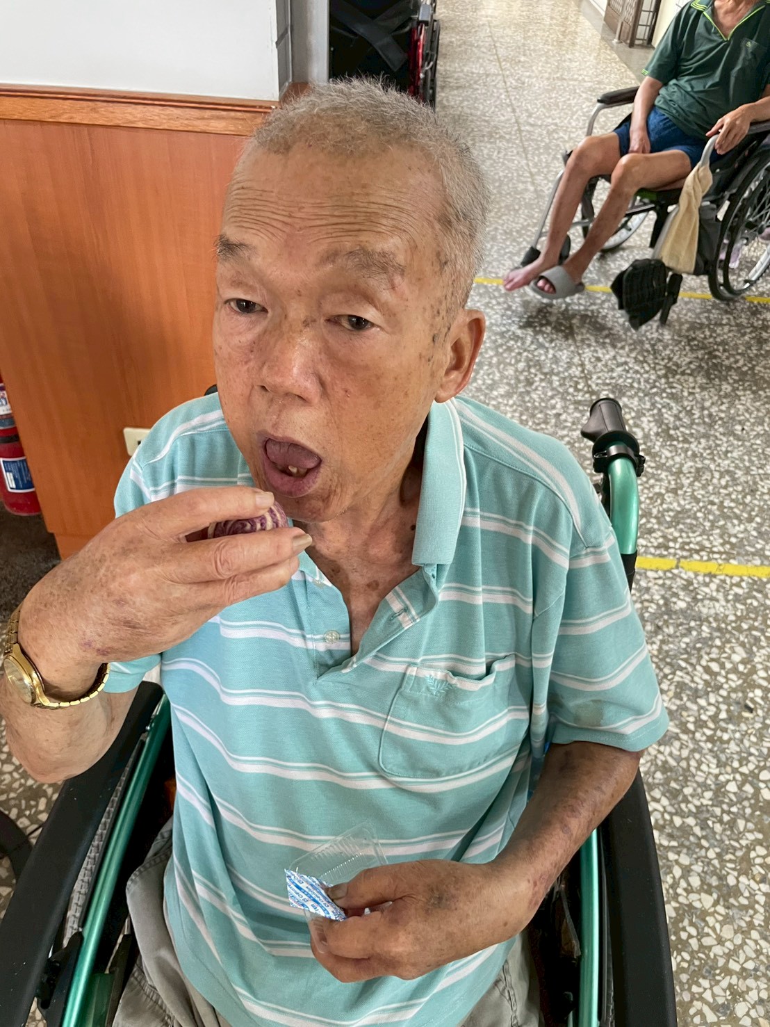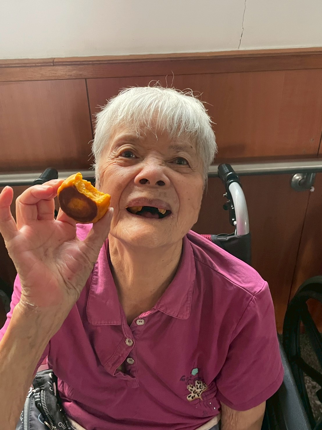 爺爺奶奶們品嚐月餅時笑容滿面😊, 照服員們也一同陪伴,互道「中秋快樂~🌕💬」💕, 溫馨氛圍感染整個中心🎶💞。