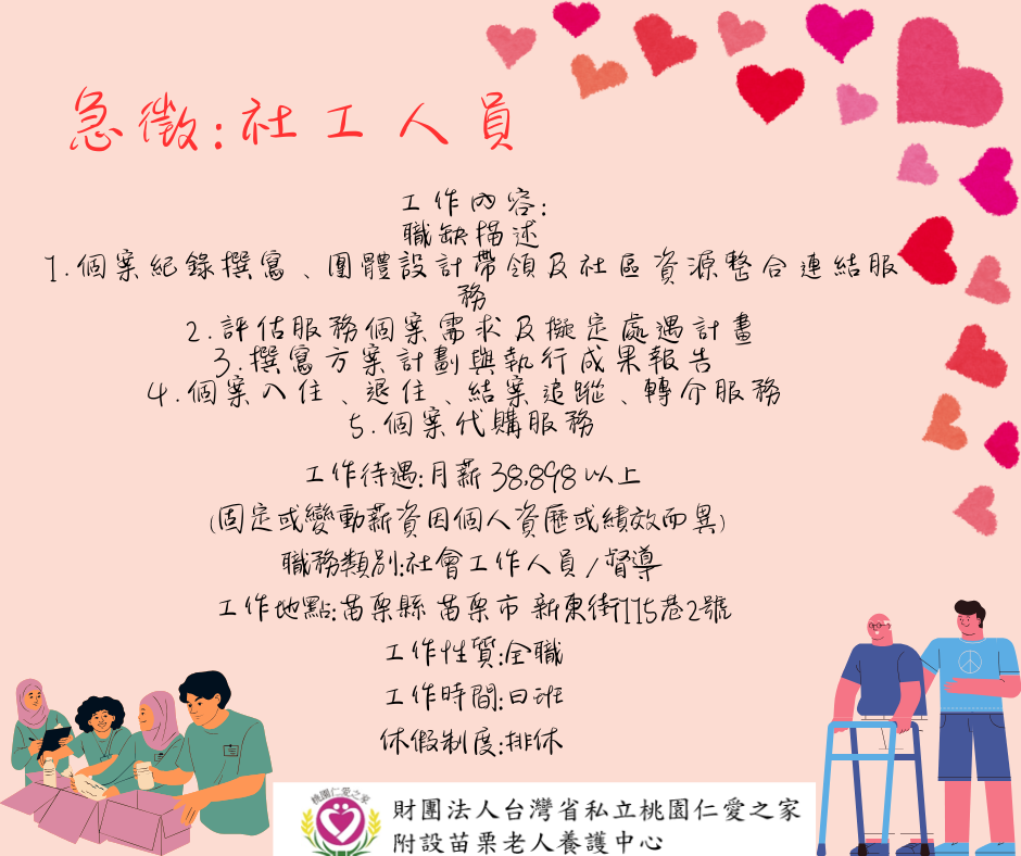 苗栗老人照護中心誠摯邀請社工人員和照護人員加入我們的大家庭!